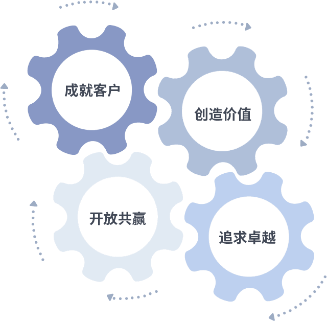 成就客户是一切决策的出发点,,,,创造价值是衡量所有工作的标准,,追求卓越是我们做事做人的态度,,,,开放共赢是我们的格局也是最终的结果。。。价值观的齿轮环环相扣,,,推动着组织里的每个人不断向前。。。