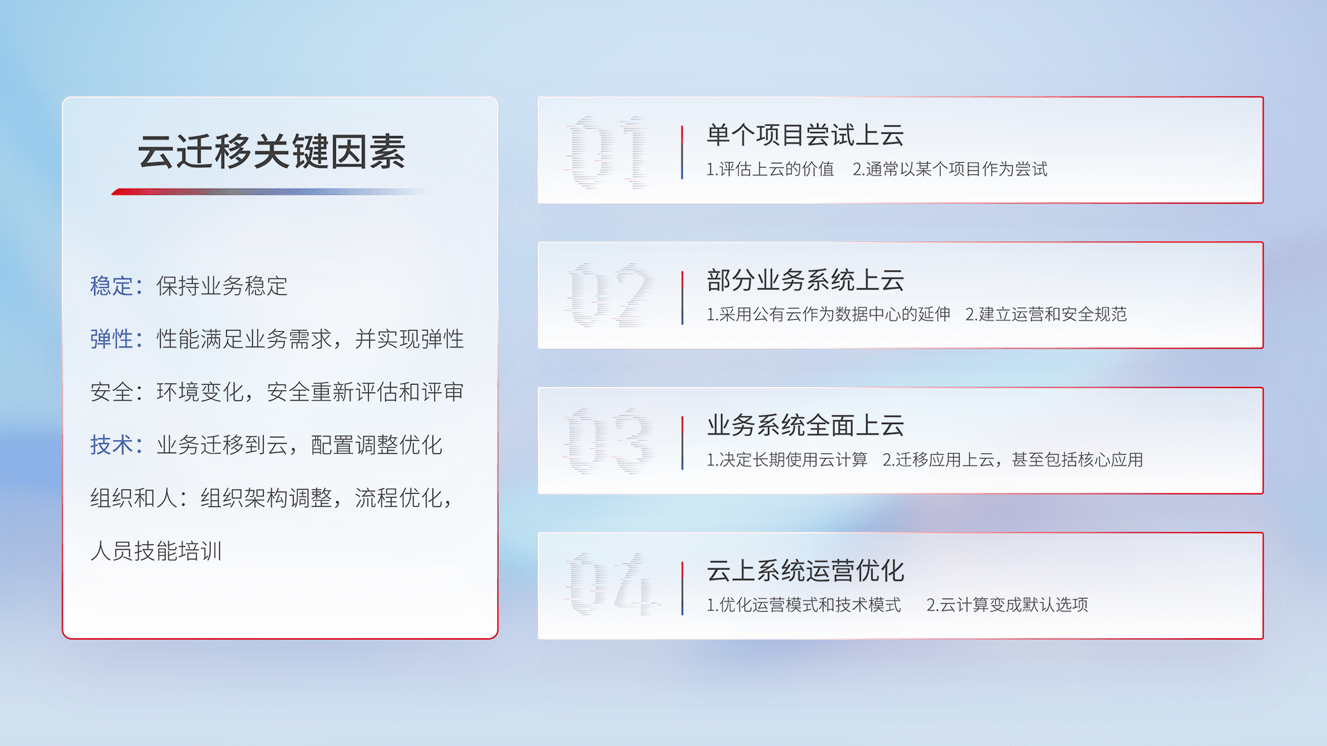 结合实际业务,,,从规划设计、、、、云平台选型、、云原生改造、、数据迁移、、、集成交付,,,迁移全过程为客户识别最佳上云路径,,,做好风险识别管理,,,设计网络架构、、、身份权限、、、安全审计合规、、、、操作审计、、日志审计、、、、监控告警策略、、多站点容灾设计等,,对云上基础设施进行整体规划,,,,提升IT治理水平,,,以满足弹性、、、高可用、、高性能的需求。。。