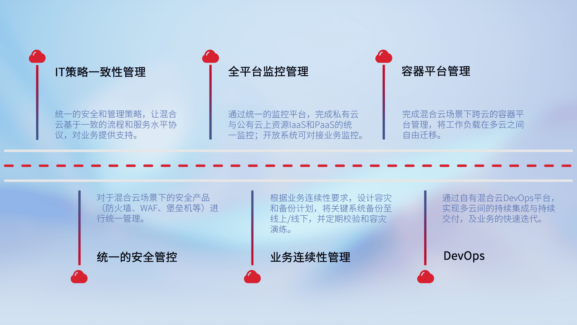 通过多云纳管,,,以统一的资源数据模型把客户的云资源进行抽象和封装,,进而实现对多云资源的统一操作,,保障云资源管理的可靠性、、、稳定性与可用性。。。。量身定制化运维内容,,,,配置、、、开发运维、、、、补丁管理、、备份、、、监控、、、、认证和访问管理、、审计和日常巡检等,,,,保障在用云过程中的可靠度,,稳定度以及高可用率。。。。