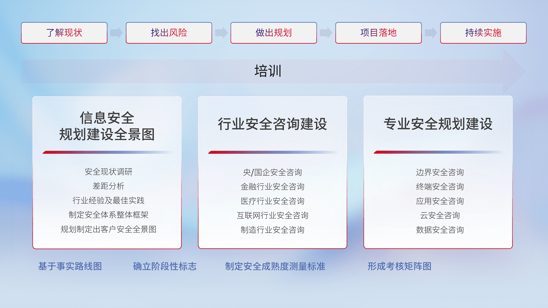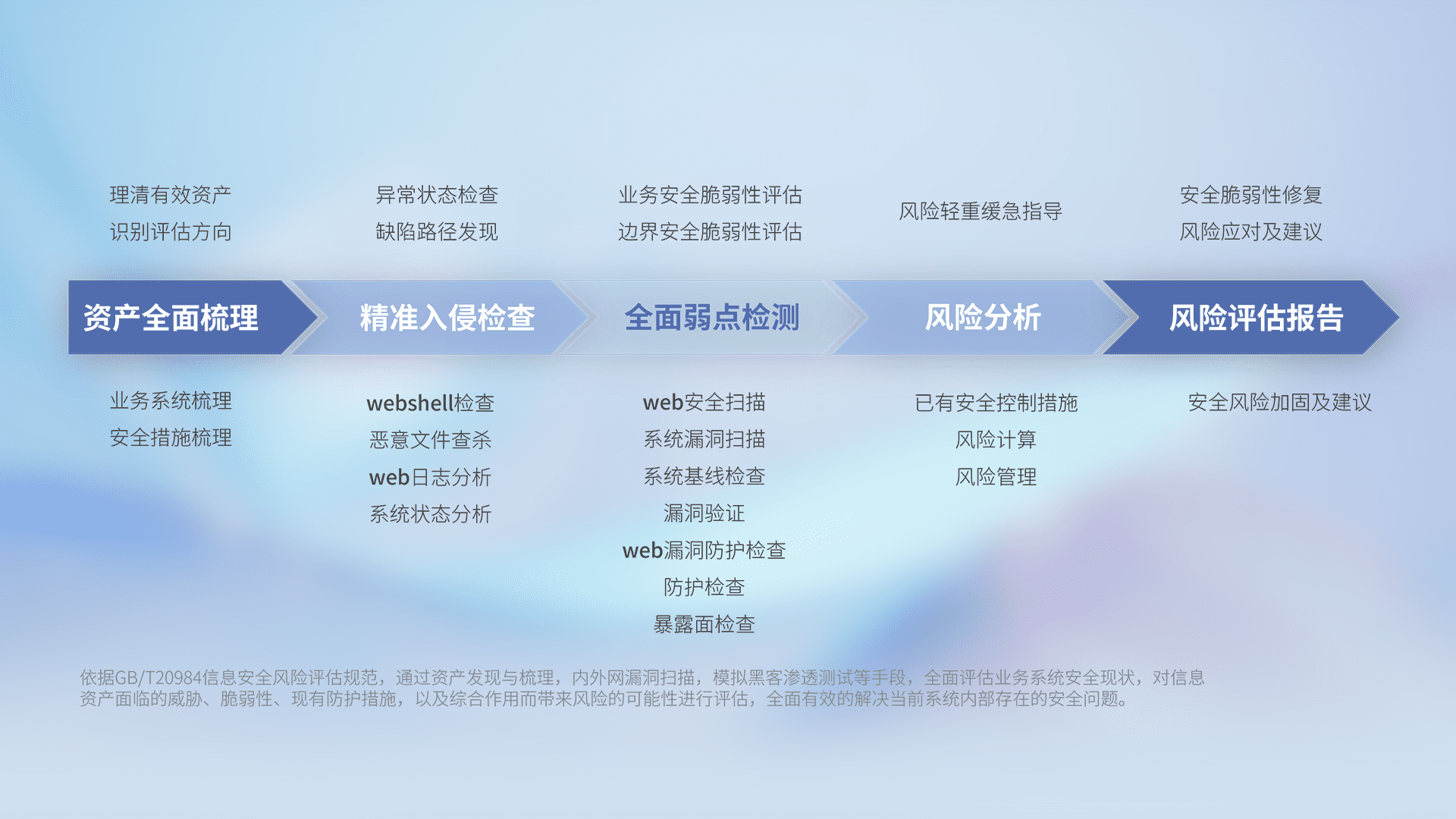 针对客户行业特性,,,,以专业的安全服务+多厂商联合解决方案提供专属的一站式安全管理服务,,帮助客户全面感知网络空间威胁,,,,基于识别、、、检测、、、、分析、、、、防护、、、监测、、响应的服务理论模型,,,,从方案咨询、、集成交付、、评估验证、、优化加固、、、运维运营,,,,致力于为客户提供完整的闭环管理式安全服务。。以实战经验为客户打造高抵御风险的安全体系,,,,帮助客户发现威胁、、、、对抗威胁、、处置威胁,,,,不断积累安全对抗能力,,,持续保障数字化安全。。。